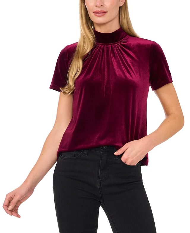 CeCe Women's Velvet Mock-Neck Tie-Back Short-Sleeve Top