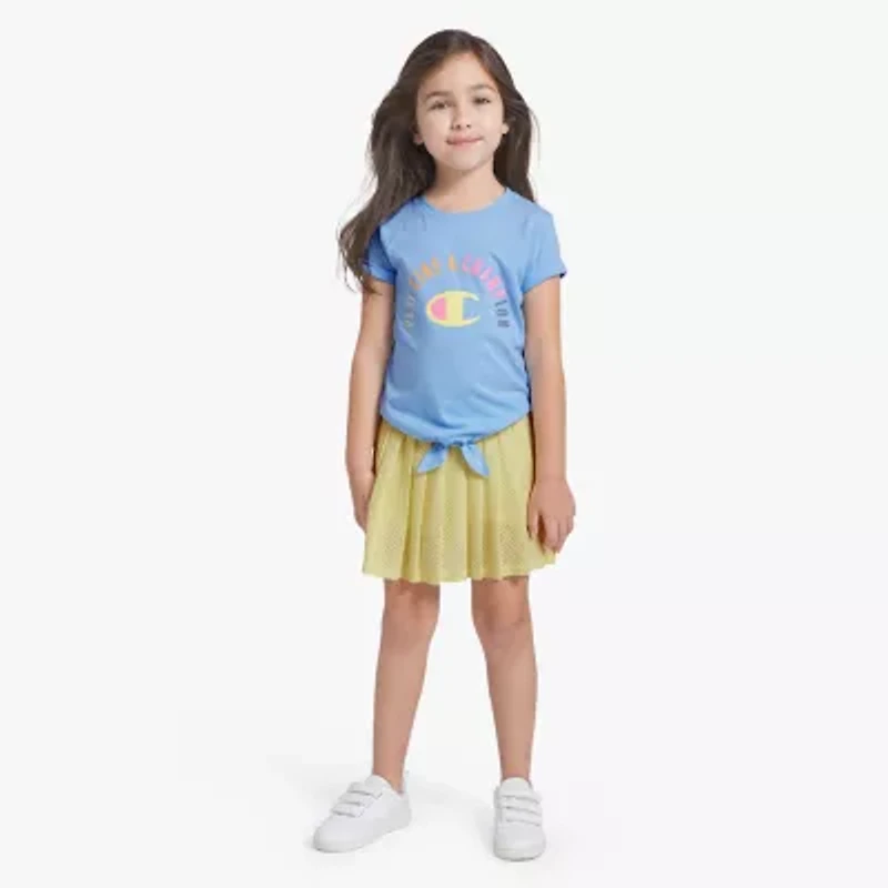 The Champion Little Girls 2-Piece Skort Set lets her get dressed in an instant. This 2-piece set for girls includes a tie-front tee and a pleated skort. Designed with style and comfort in mind, the girls' short-sleeve tee is made from cotton-blend jersey, and the girls' skort is made from breathable mesh with built-in shorts. It's the outfit of choice for busy on-the-go days.