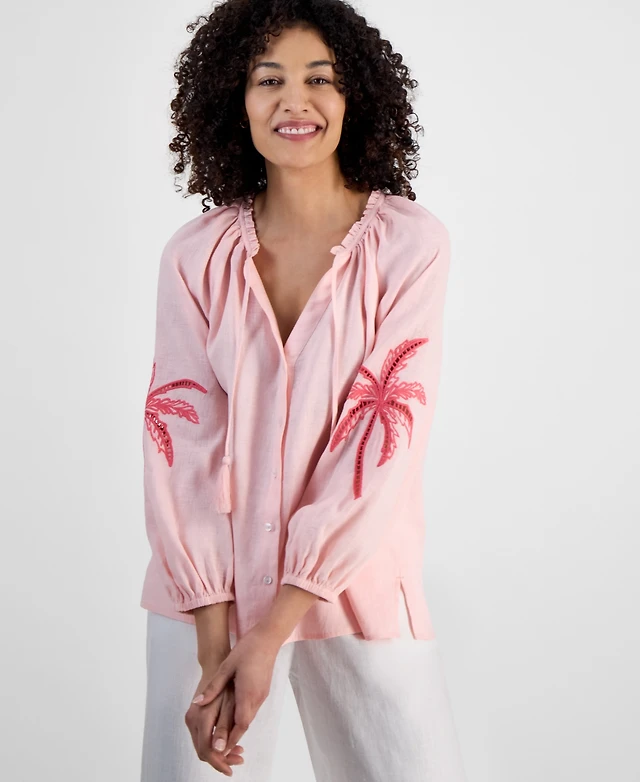 Charter Club Petite 100% Linen Tie-Neck Embroidered-Sleeve Top, Exclusively at Macy's