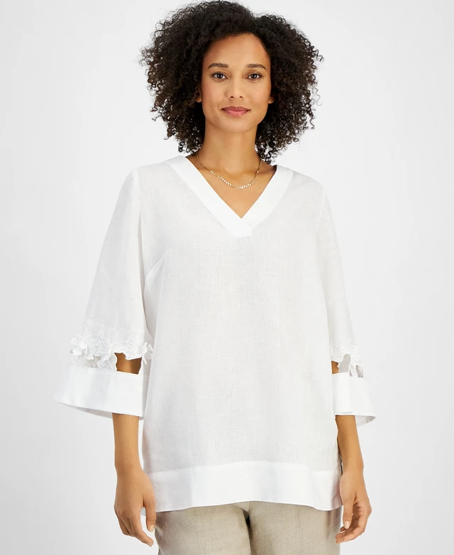 Charter Club Women's 100% Linen V-Neck Applique-Sleeve Top, Macy's Exclusive