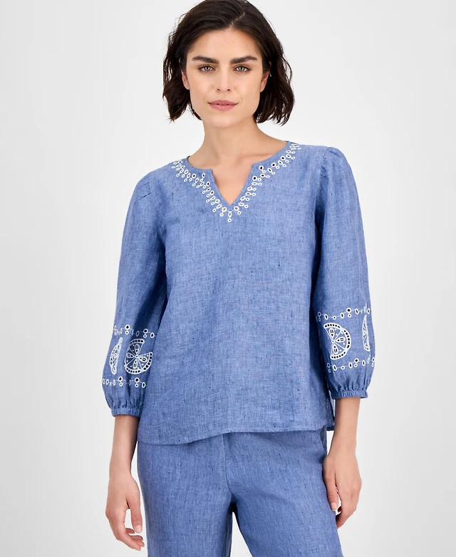 Charter Club Women's Embroidered 100% Linen Top, Exclusively at Macy's