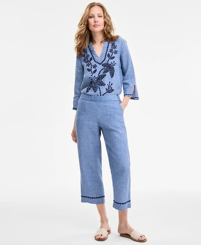 Charter Club Women's Embroidered-Cuff 100% Linen Woven Cropped Pants, Exclusively at Macy's