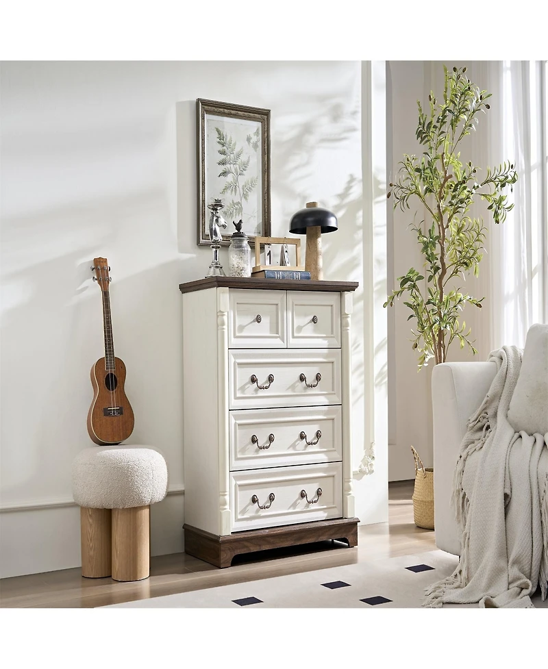 Elevate your home s storage and style with this vintage 5-drawer dresser, designed to offer both function and aesthetic appeal. Featuring a charming dual-tone finish and textured surface, this piece adds a warm, rustic touch to any room. Made from durable solid wood and high-quality engineered wood, it s built to last and offers ample storage space for clothes, blankets, and other essentials. Perfect for bedrooms, entryways, or living rooms, this dresser combines practicality with timeless design, ensuring your space remains organized and stylish for years to come.