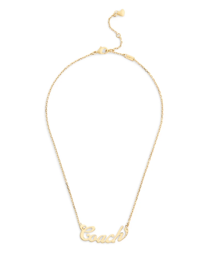 Refined chain necklace featuring iconic signature Coach name plate pendant adorned with delicate crystal stone perfect for everyday.