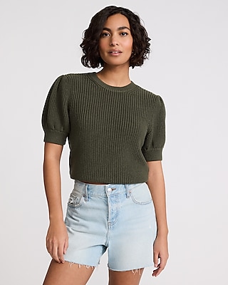 Merino-Blend Crew Neck Short Puff Sleeve Sweater