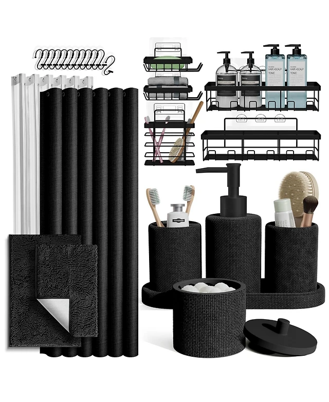 Complete Burlap-Texture Polyresin Bathroom Decor & Accessory Set with Shower Curtain, Caddy Bath Rugs