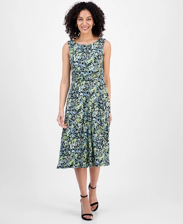 Connected Petite Shirred-Waist Sheer-Sleeve Midi Dress