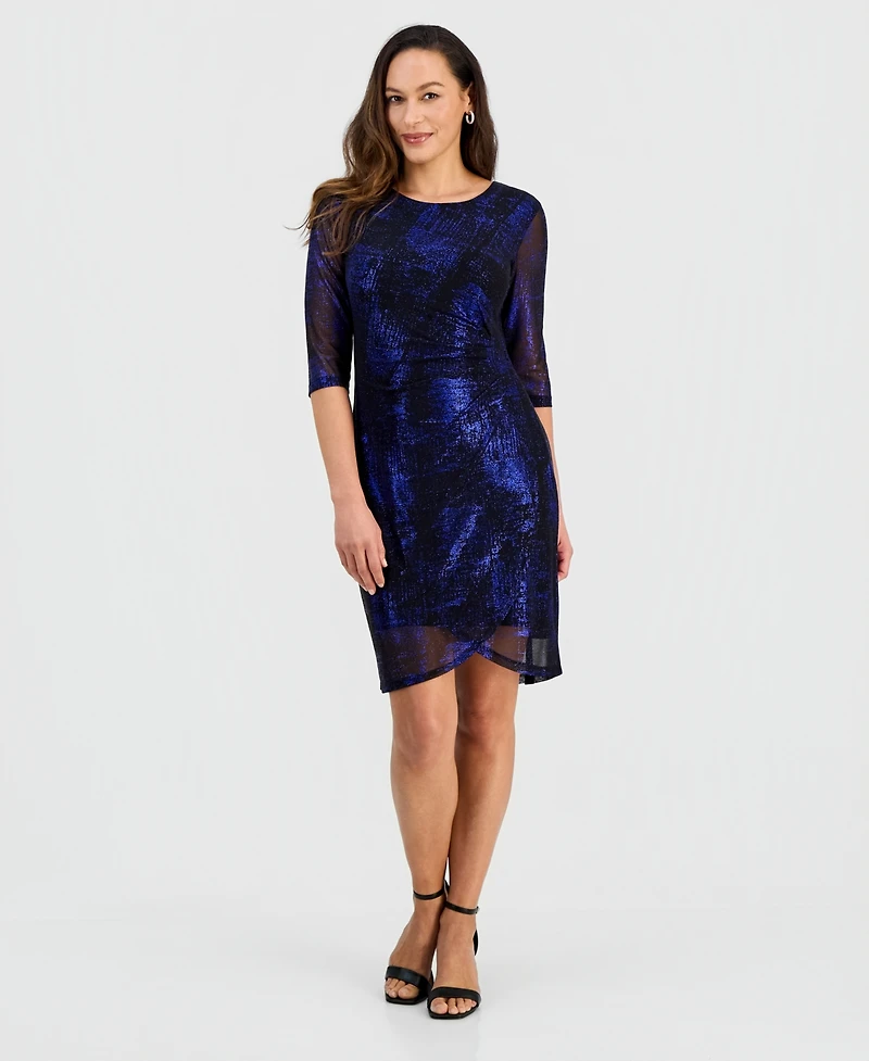 Connected Petite Sparkle Mesh 3/4-Sleeve Sheath Dress