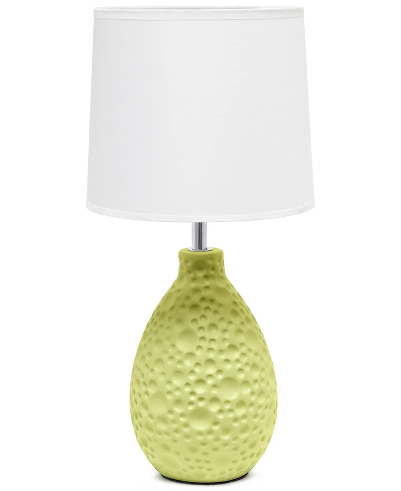 A bit of an upgrade to your traditional table lamp The ceramic tear drop shaped base has an evenly distributed thumbprint like texture throughout, and in the color of your choice. All options are paired with a complimenting white fabric shade.