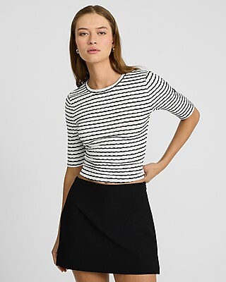 Jacquard Striped Crew Neck Elbow Sleeve Cropped Tee