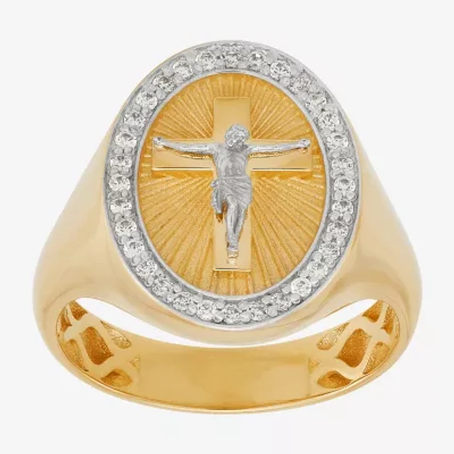 Crucifix Mens White Cubic Zirconia 10K Gold Cross Signet Ring