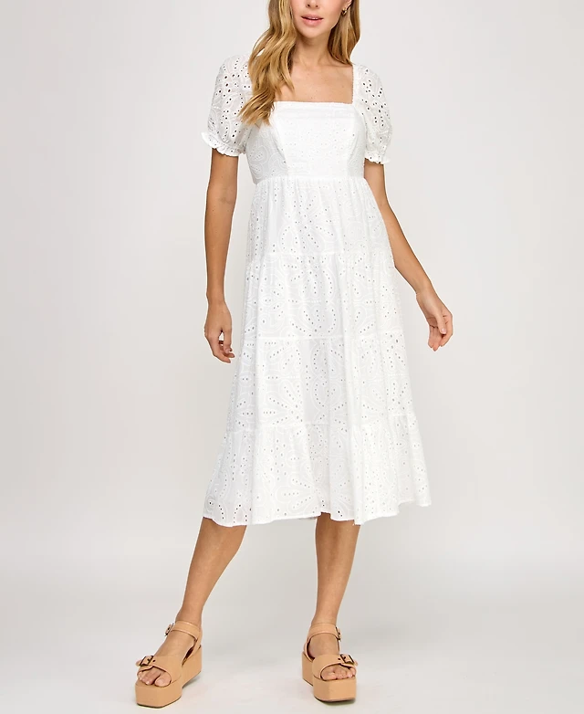 Crystal Doll Juniors' Embroidered Eyelet Puff-Sleeve Dress