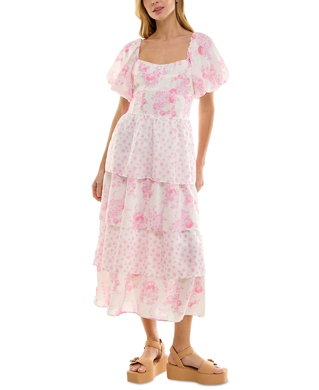 Crystal Doll Juniors' Floral-Print Bubble-Sleeve Smocked-Back Tiered Dress