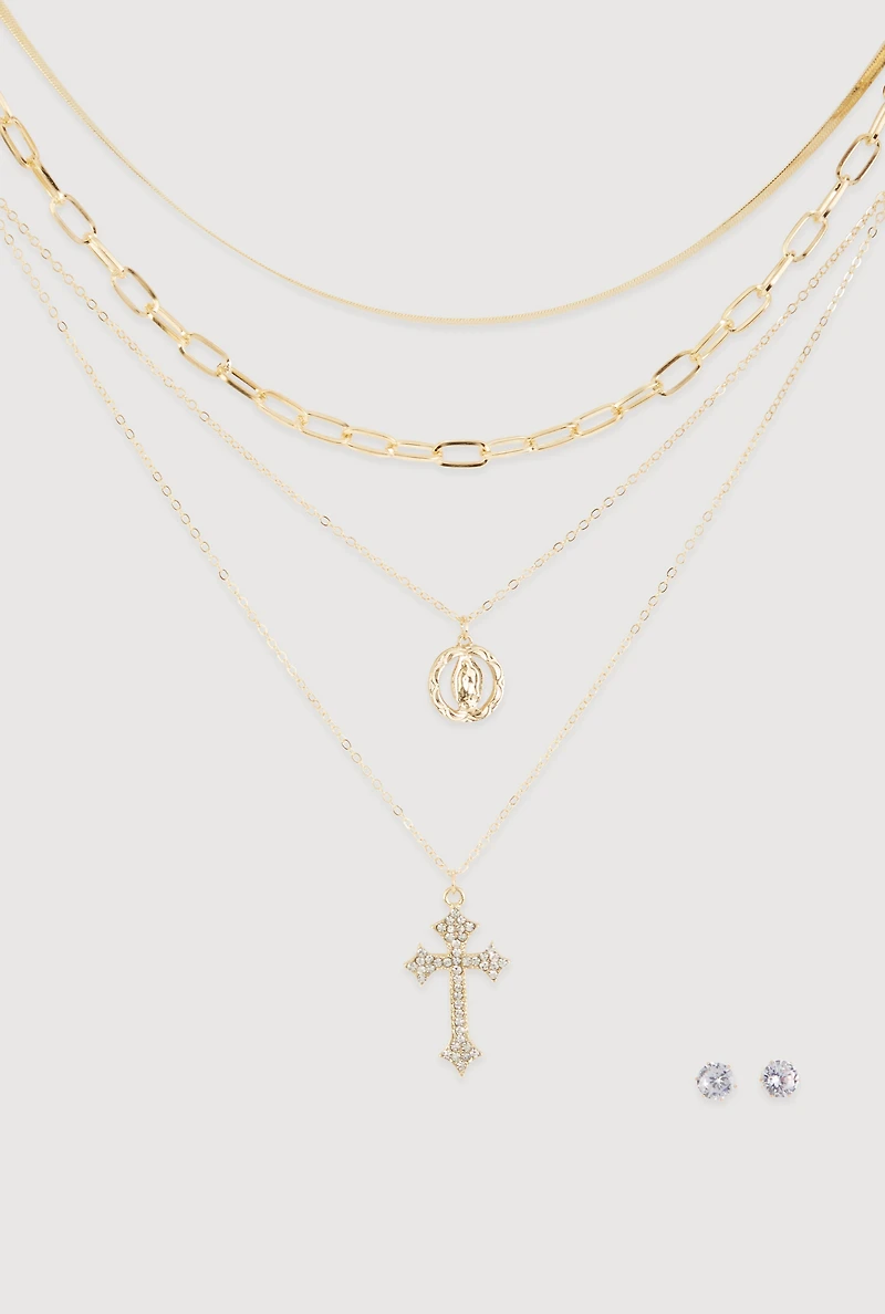 Cubic Zirconia Rosary Layered Chain Necklace and Stud Earrings