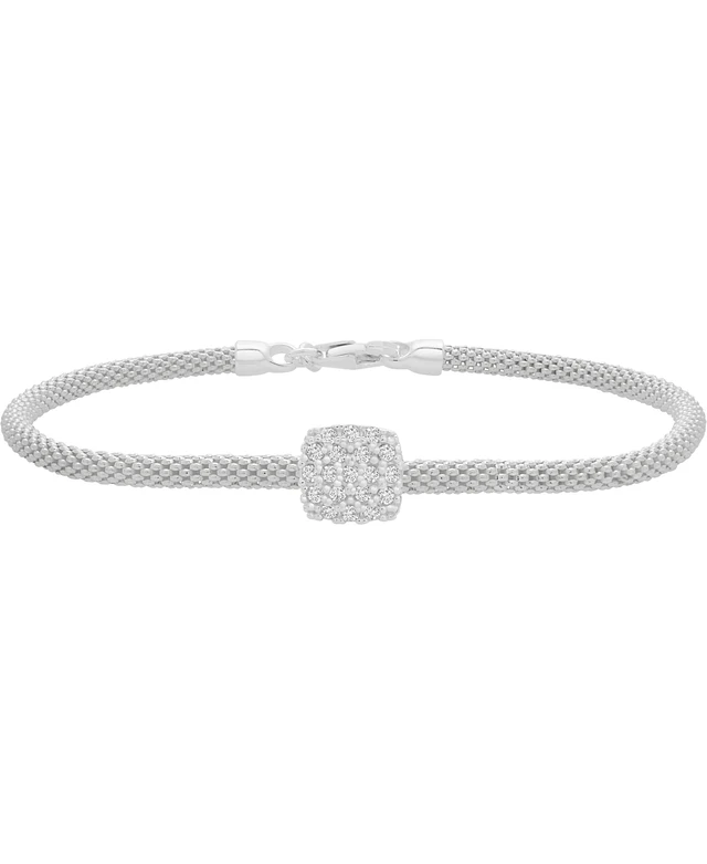 Cubic Zirconia Square Charm Mesh Link Bracelet in Sterling Silver