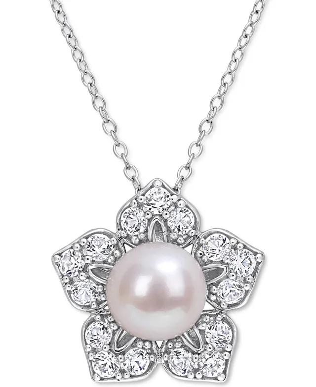 Cultured Freshwater Pearl (8-1/2mm) & Lab-Grown White Sapphire (1-1/3 ct. t.w.) Flower 18" Pendant Necklace in Sterling Silver