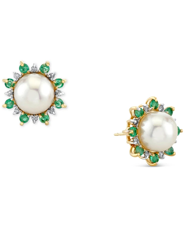 Cultured Freshwater Pearl (8mm), Emerald (5/8 ct. t.w.) & Diamond (1/8 ct. t.w.) Stud Earrings in 10k Gold