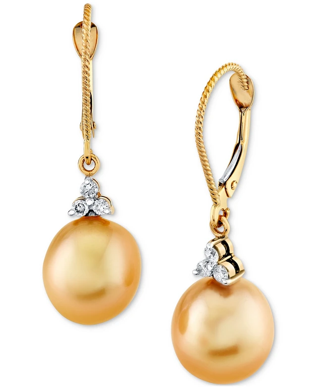 14k Gold Earrings, Cultured Golden South Sea Pearl (9mm) and Diamond (1/5 ct. t.w.) Drop Earrings