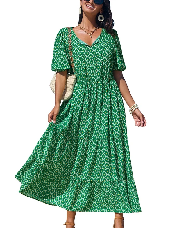 Cupshe Women's Boho Floral Notched Neck Puff Sleeve Midi Beach Dress