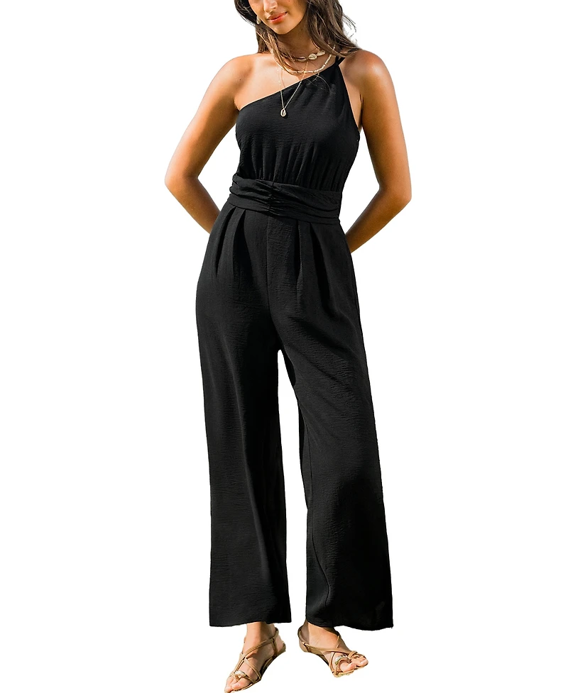 The Gotta Glow Black Jumpsuit brings confident, after-dark energy without trying too hard! An asymmetrical neckline and sleeveless cut pair with a wide-leg silhouette for a look that feels bold, easy, and ready for plans. Product code: CAA13E6B005GC