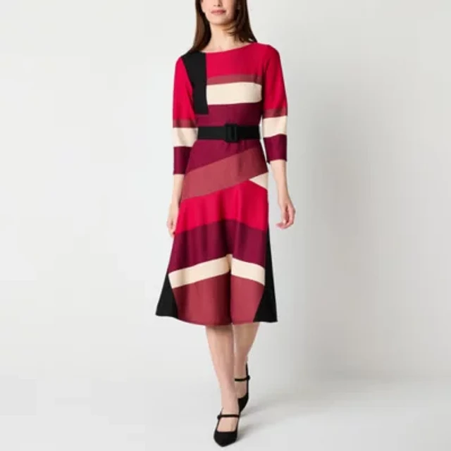 Danny & Nicole Womens 3/4 Sleeve Midi Fit + Flare Dress