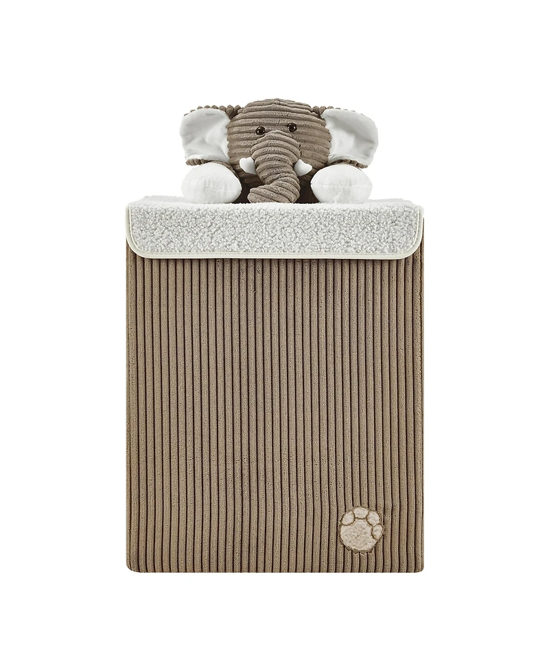 The Corduroy Plush Kids Laundry Hamper combines utility and whimsy to offer the perfect laundry companion or toy storage solution in your children s room. The compact design easily fits in the corner of any bedroom or bathroom, maximizing organization with playful flair. The textured corduroy fabric enhances the sentimental charm of this classic kids hamper. With an attached lid and a secure hook and loop fastener flap, items stored in the hamper are neatly out of sight, whether you choose to store clothes, toys, or other items. The lightweight form is also easily collapsible, folding completely flat for convenient storage. The hamper features a lid adorned with a plush animal, encouraging for your child to store their toys or put away clothes. This lovable hamper is available with either a Gray Elephant or a Brown and White Dog atop the attached hamper lid. Each corduroy textured hamper matches the color scheme of the attached stuffed animal for a coordinated and nostalgic look.
