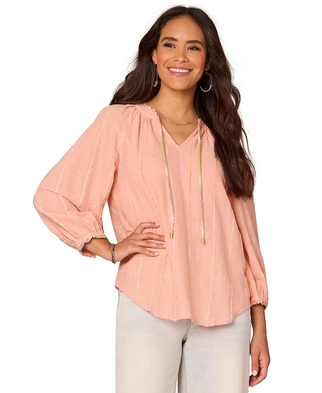 Democracy Petite Embroidered Roll-Cuff Scoop-Neck Top