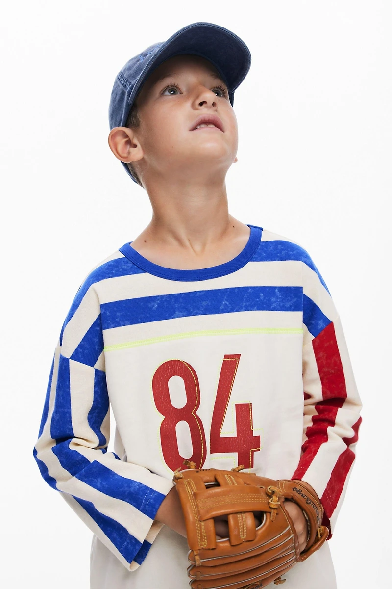 3/4 sleeve T-shirt with striped print on the sleeves and embroidered numbers on the front.