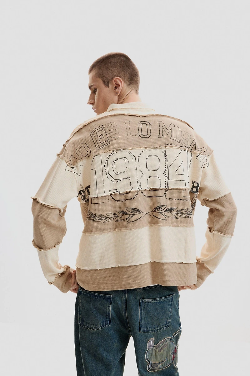 Long-sleeved polo shirt in 100% cotton knit with a wide horizontal stripe print and a solid-colour polo collar.
