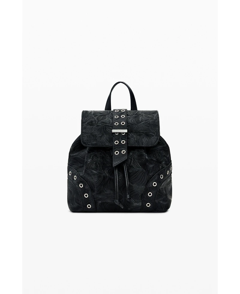 Small backpack in leather effect, with flap, perforated details, and decorative metal eyelets.
