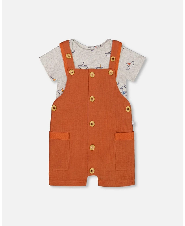 Deux par Baby Boys Printed Organic Cotton Onesie And Muslin Shortall Set Terracotta Small Boats