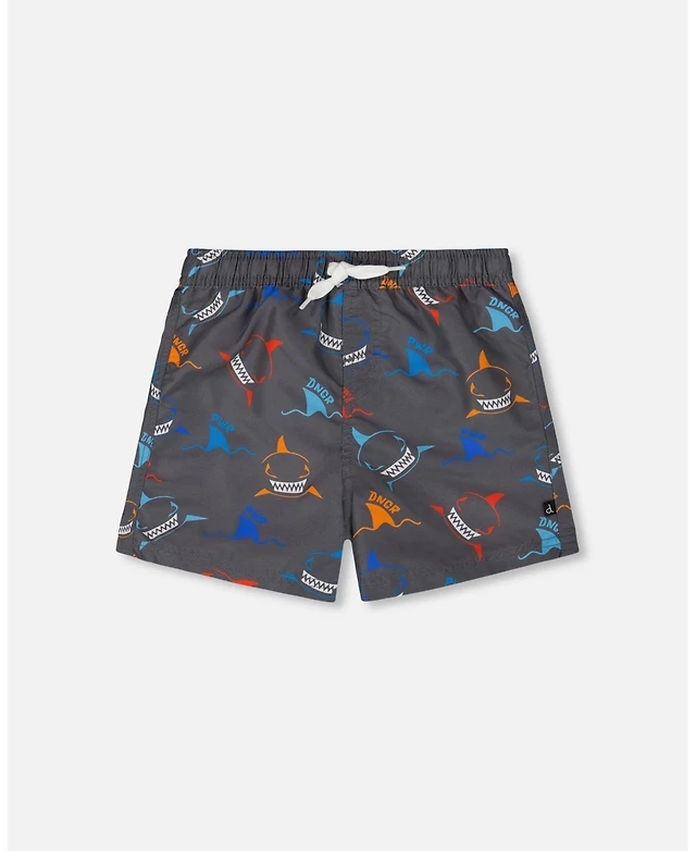 Deux par Boy Printed Boardshorts Orange, Red, And Blue Sharks On Gray - Toddler|Child