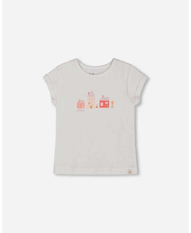 Deux par Deux Baby Girls Flat Back Rib Top With Print White And Pink House