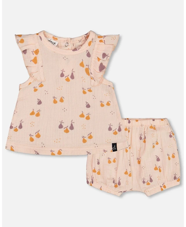 Deux par Deux Baby Girls Printed Muslin Top And Bloomer Set Peach With Pears