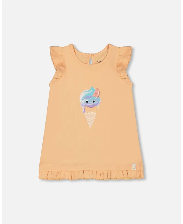 Deux par Deux Big Girls Organic Cotton Tunic With Frill And Print Light Orange And Ice Cream Cone