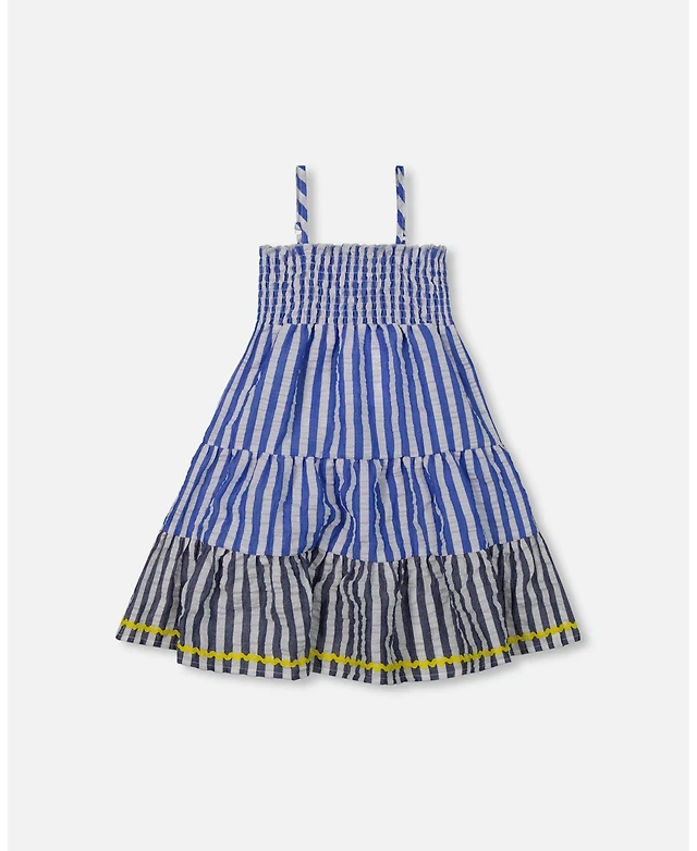 Deux par Deux Big Girls Smocked Seersucker Peasant Dress Blue And White Striped