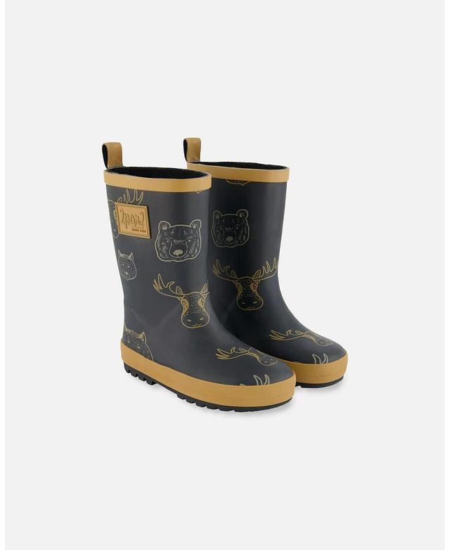 Deux par Deux Little Boys Printed Rain Boots Beige Animals On Black Background - Toddler|Child