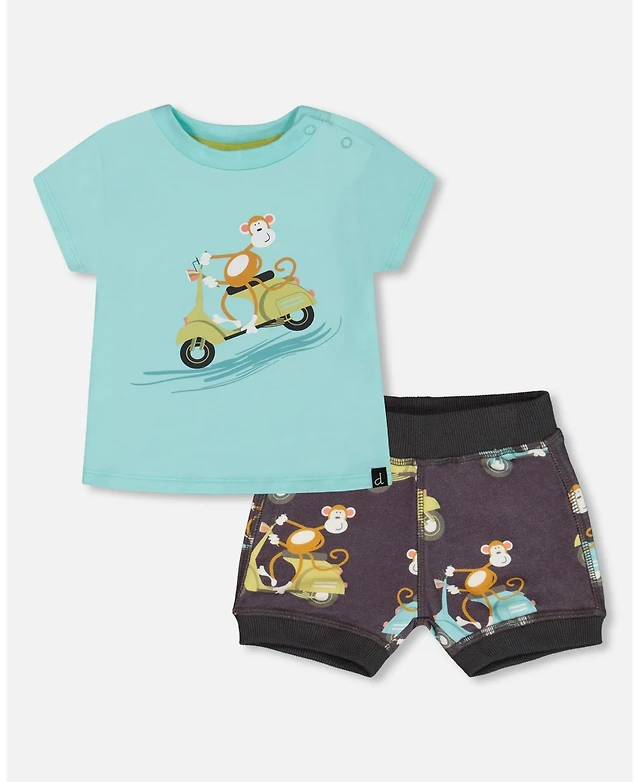 Deux par Deux Toddler Boys Two-Piece Top And Short Set Monkey On Navy And Turquoise Moped - Toddler|Child
