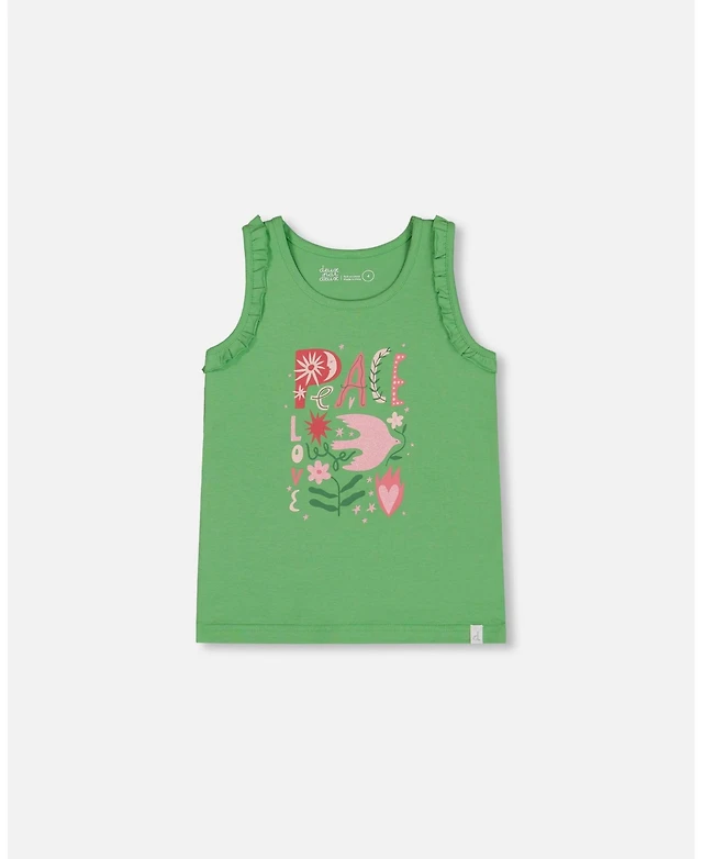 Deux par Deux Toddler Girls Organic Cotton Tank With Frills Flowers On Green Background - Toddler|Child