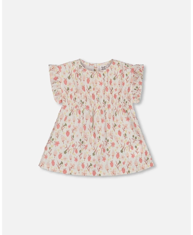 Deux par Deux Toddler Girls Printed Seersucker Blouse With Frills Pink Flowers On Cream Background - Toddler|Child