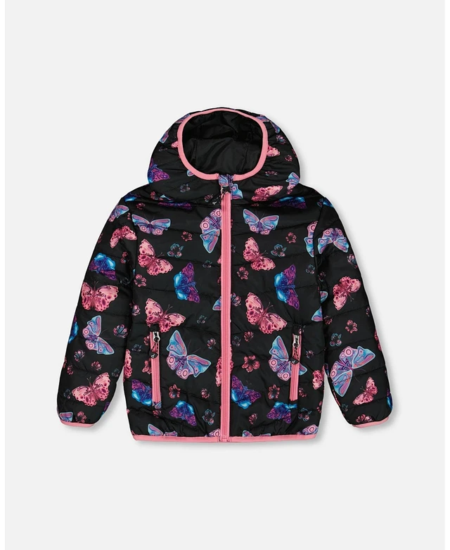 Deux par Toddler Girls Printed Quilted Mid-Season Jacket Multicolored Butterflies On Black Background - Toddler|Child