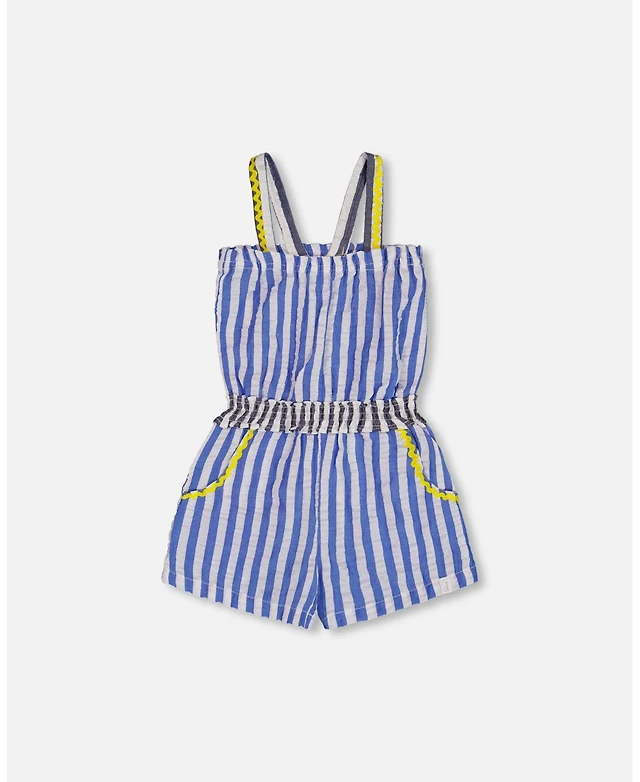 Deux par Toddler Girls Sleeveless Seersucker Romper Blue And White Striped - Toddler|Child