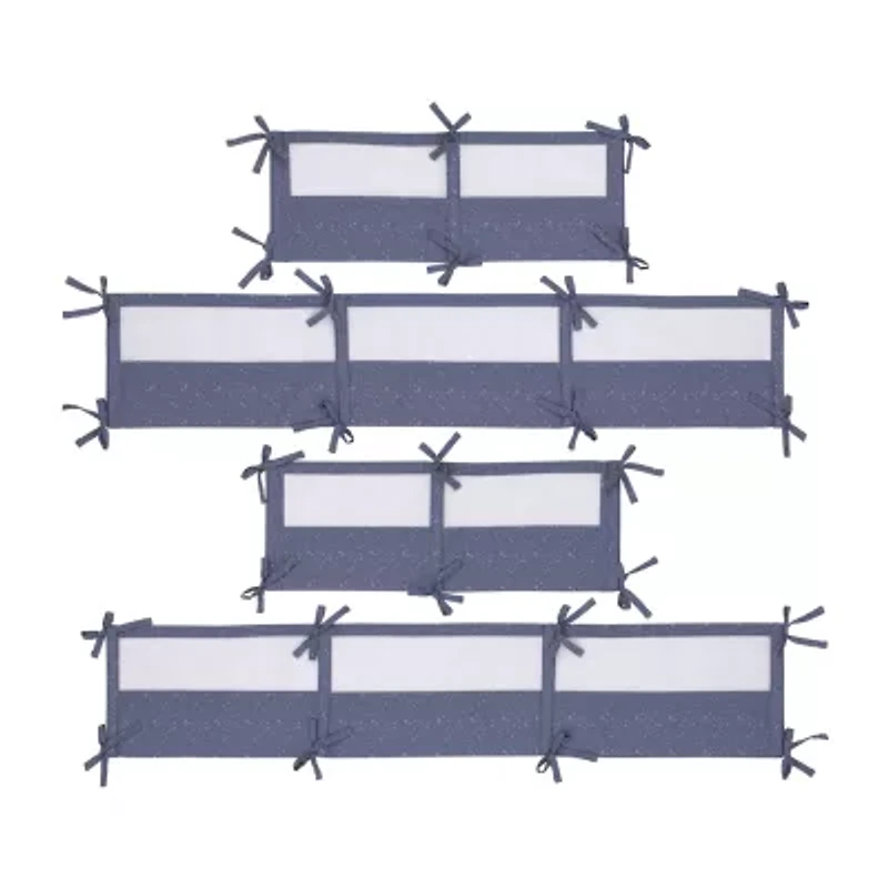 The disney love mickey secure-me crib liner is featured in a playful allover pattern in solid dark blue with tiny gray dots and tiny mickey mouse ears! This easy to install four-piece design helps keep arms and legs safe inside crib slats. No more dropped or lost pacifiers. The white mesh design keeps baby cooler in warmer temperatures. The 4-piece flexible crib liner fits most standard and convertible cribs. Made of 2 long sides that measure 51" x 10" and 2 short sides measuring 27" x 10" to achieve a custom fit. Coordinates with the disney love mickey infant bedding and accessories!