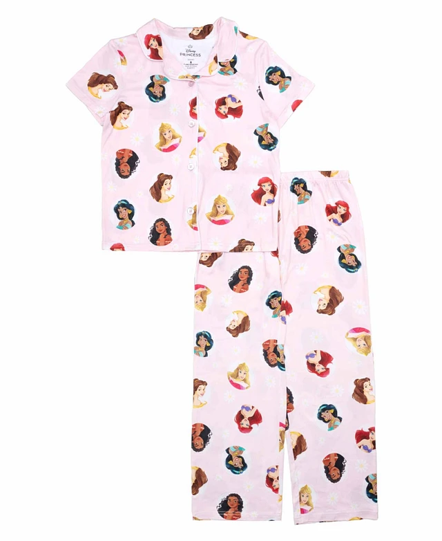 Disney Princess Little and Big Girls Short Sleeve Button Down Sleep Shirt Open Leg Pant, 2-Piece Pajama Set