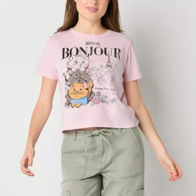 Disney The Aristocats Bonjour Semi Fit Womens Crew Neck Short Sleeve Fitted Juniors Graphic T-Shirt