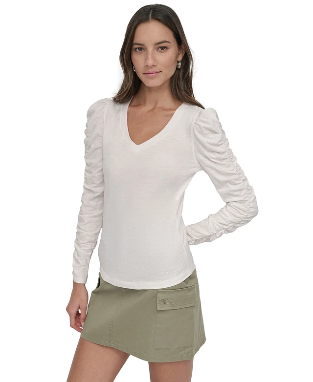 Dkny Jeans Women's Cotton V-Neck Ruched-Sleeve Top - EN2