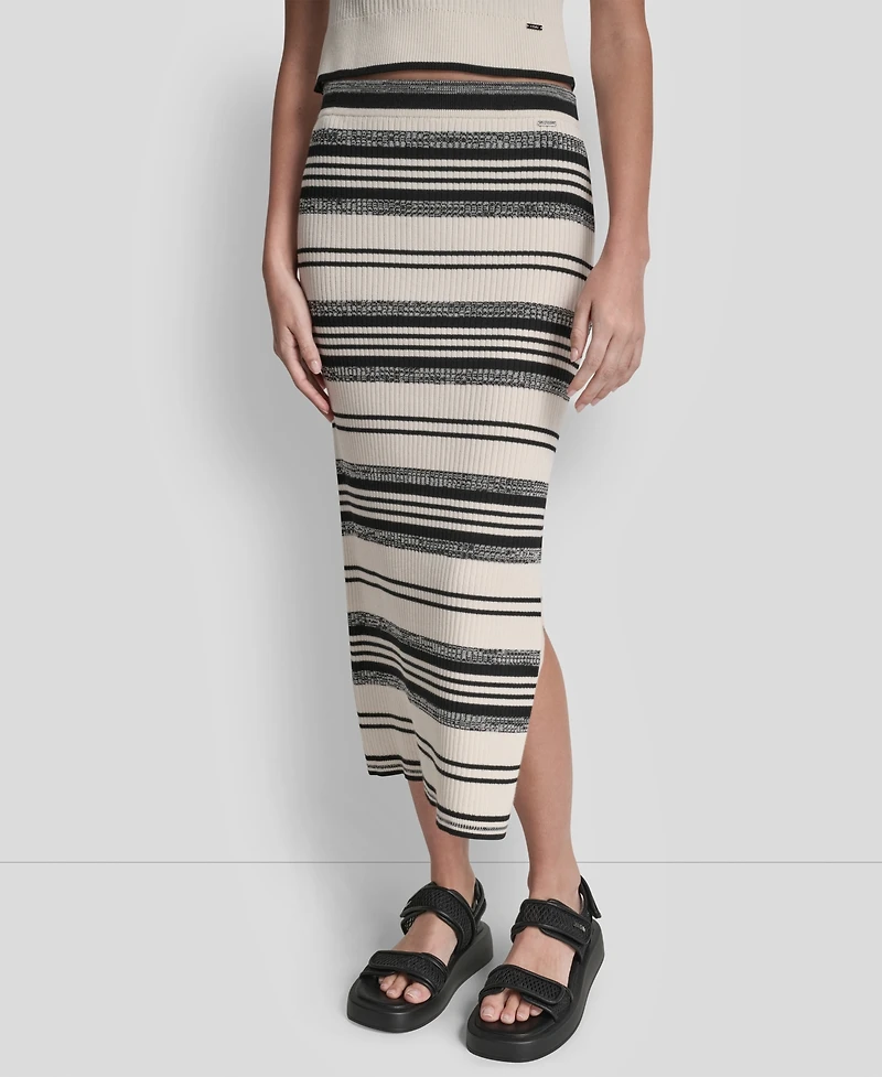 Refine your everyday style with a modern edge in this Dkny Jeans pull-on midi skirt, featuring a ribbed marl stripe pattern. A side slit and logo bar accent add subtle movement and signature polish.