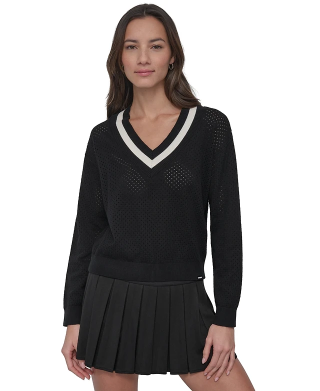 Dkny Sport Women's Open-Knit Mesh Striped V-Neck Sweater