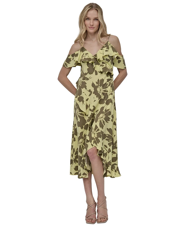 Dkny Women's Printed Cold-Shoulder Ruffle-Trim Dress
