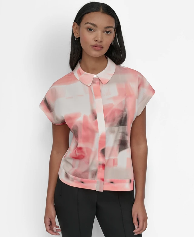 Dkny Women's Printed Short Sleeves Convertible Collar Top
